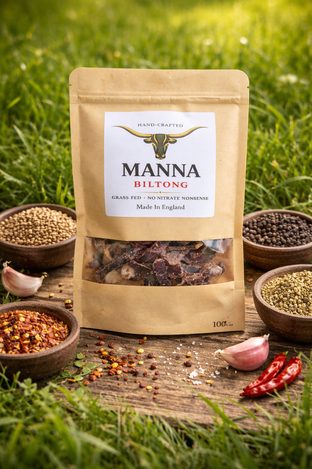 Our 100g pouch of protein-packed Manna Biltong is the perfect mid-size option — for sharing or keeping to yourself. Made in England using local grass-fed beef and no preservatives, it delivers the same rich, traditional flavour in a convenient resealable bag to keep every slice fresh.